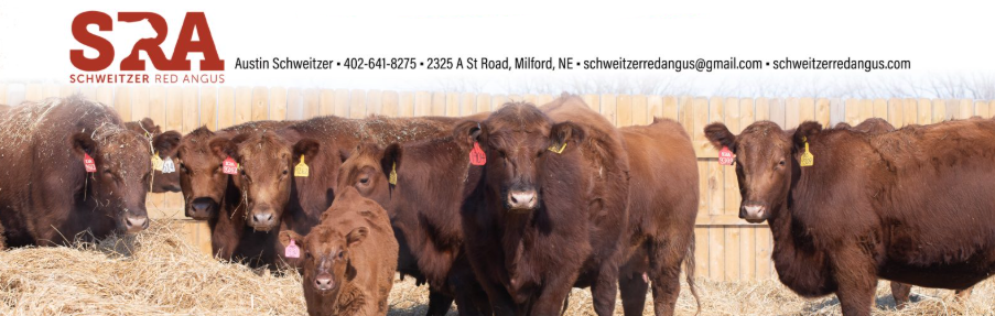 | Friday, March 20, 2026 | Schweitzer Red Angus Annual Bull & Female Sale![]() Beatrice 77 Sale Barn Beatrice, Nebraska Contact Austin Schweitzer 402-641-8275 Selling 70 Yearling and Age Advantage Bulls, 60 Registered Open Heifers, Bred Registered Cows, Bred Registered Heifers, Fall Registered Bred Heifers and Cows, Commercial Open Heifers & Commercial Bred Heifers/Pairs |